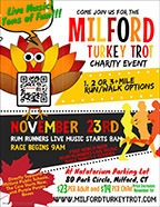 Milford Turkey Trot – Thanksgiving Morning: For the benefit of Milford organizations; Race begins at 9:00 a.m.