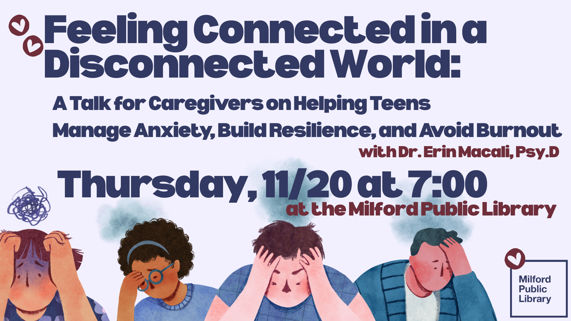 Join licensed psychologist Dr. Erin Micali, PsyD, from Sasco River Center, for an informative presentation focused on helping parents and caregivers support teens through anxiety, depression, and burnout. This session will be on November 20, 7:00 p.m. at the Milford Public Library.
