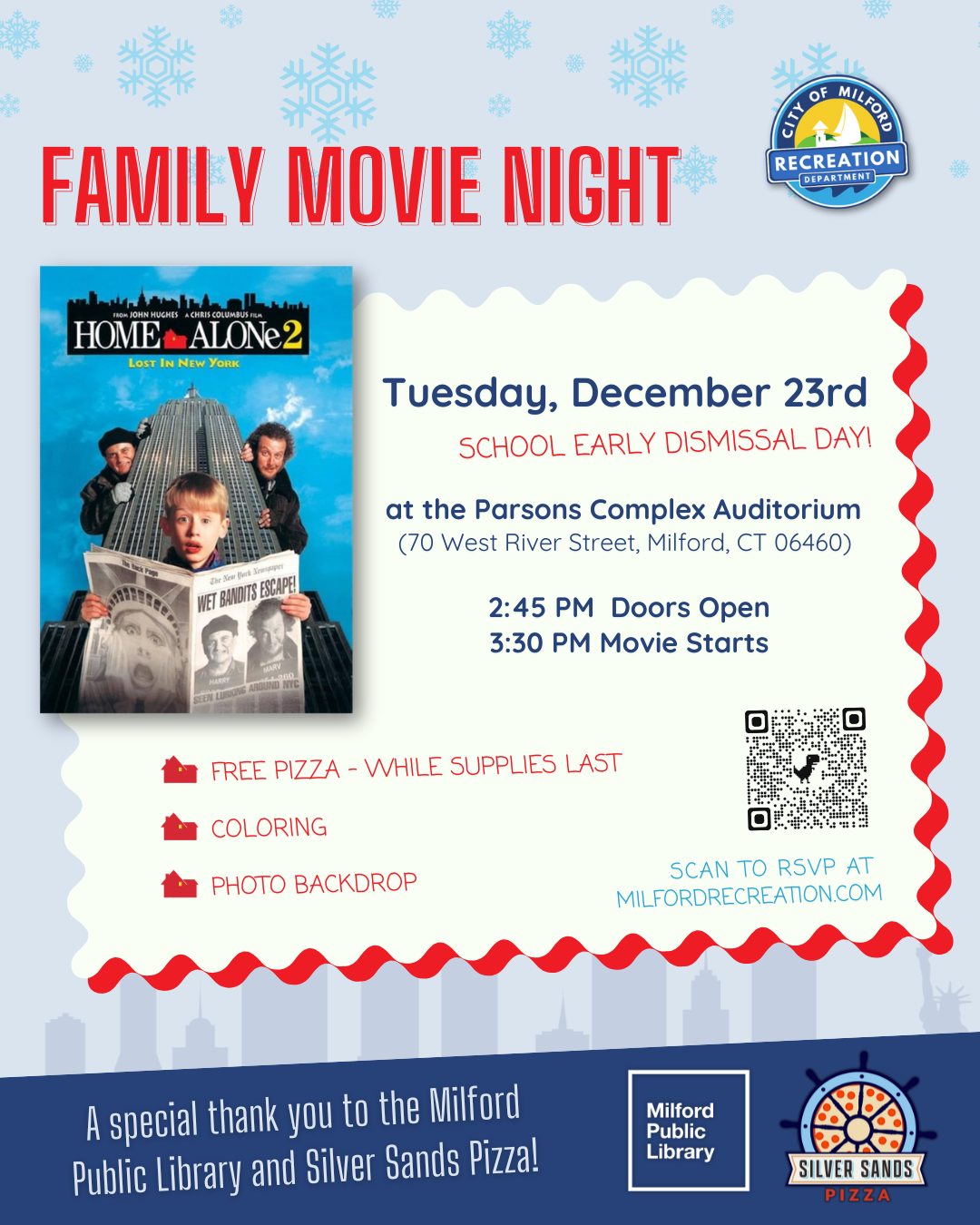The Milford Recreation Department will host a Holiday Family Movie on Tuesday, December 23. Join to watch Home Alone 2: Lost in New York at the Parsons Complex Auditorium at 3:30 p.m.